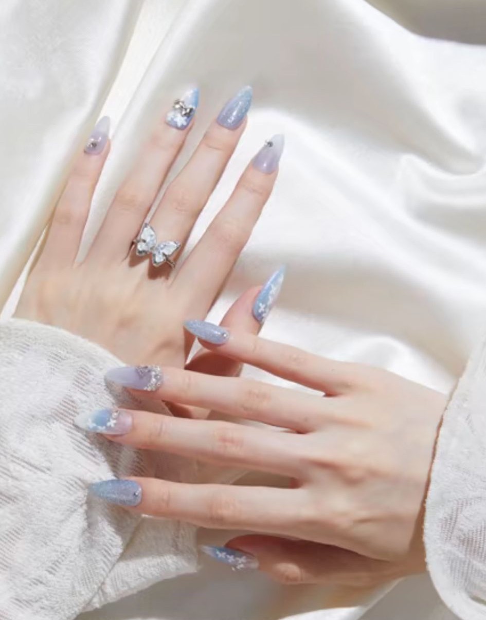 淡いブルーのクールなデザインです。長めのチップで大人っぽさを演出。ホワイトxブルーxシルバーの色使いがとてもステキなネイルチップです。指の細見え効果◎