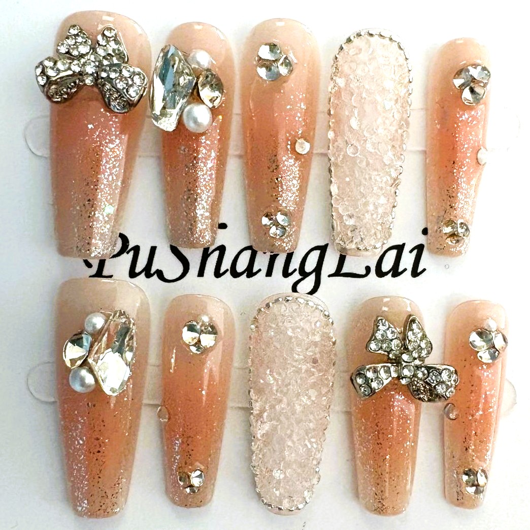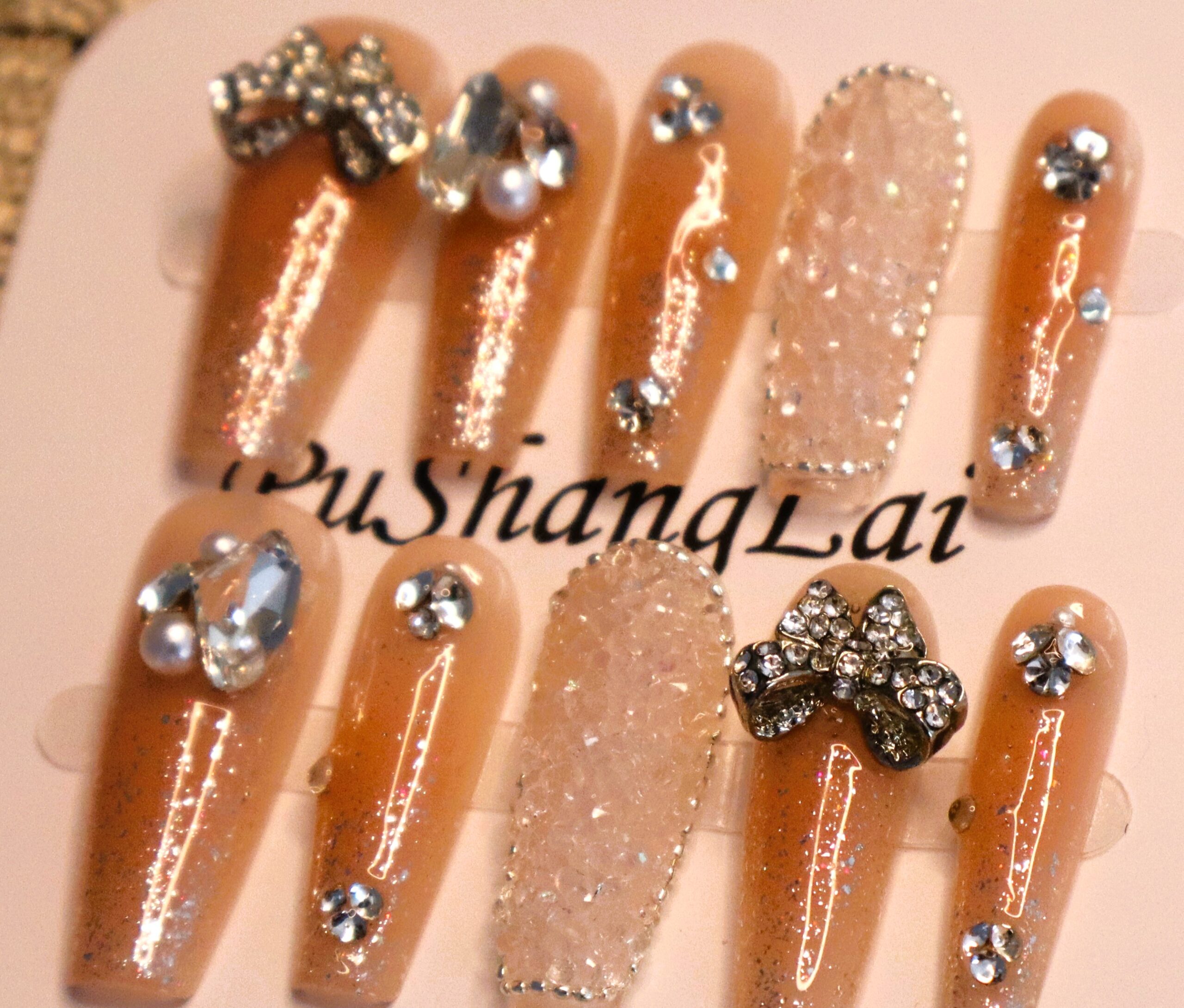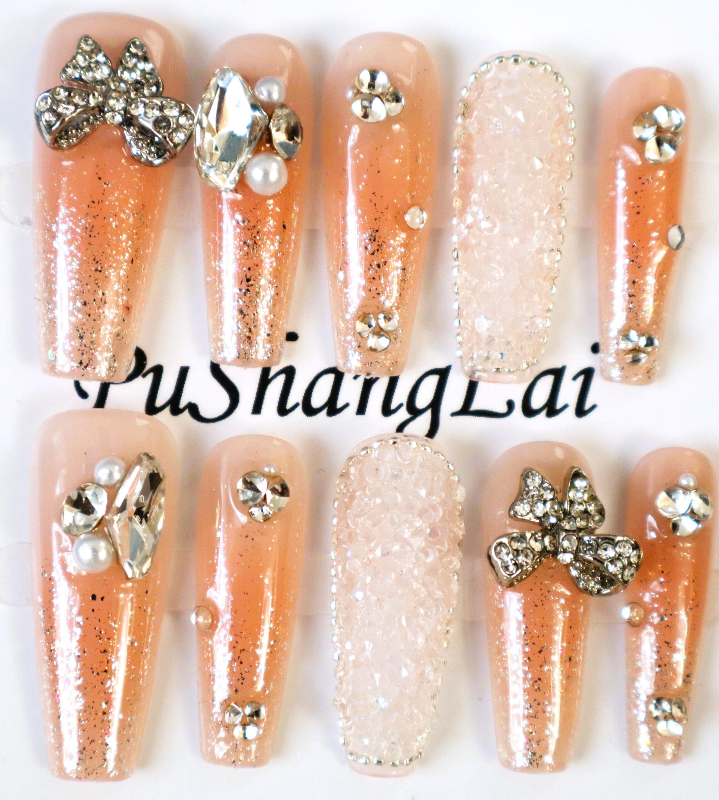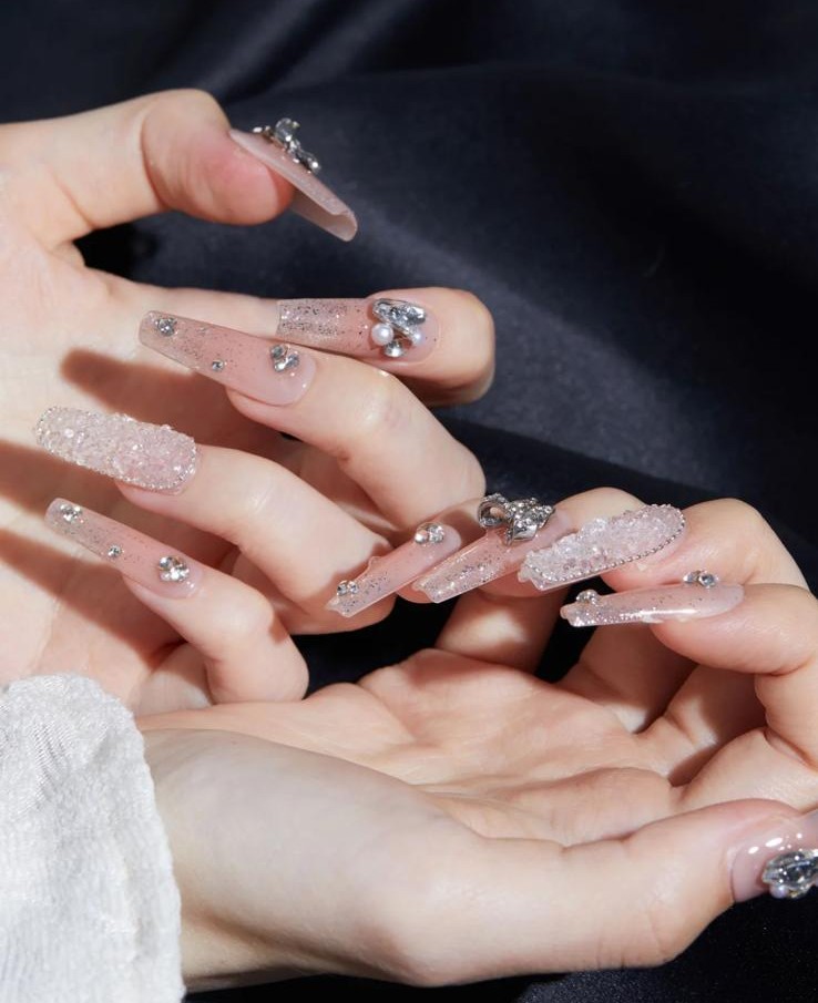 サンゴピンクにシルバーのリボンとラメの乗ったロングタイプのネイルチップです。白いサンゴの塊のようなパーツがとても手ざわり良く、インパクトあるデザインです。