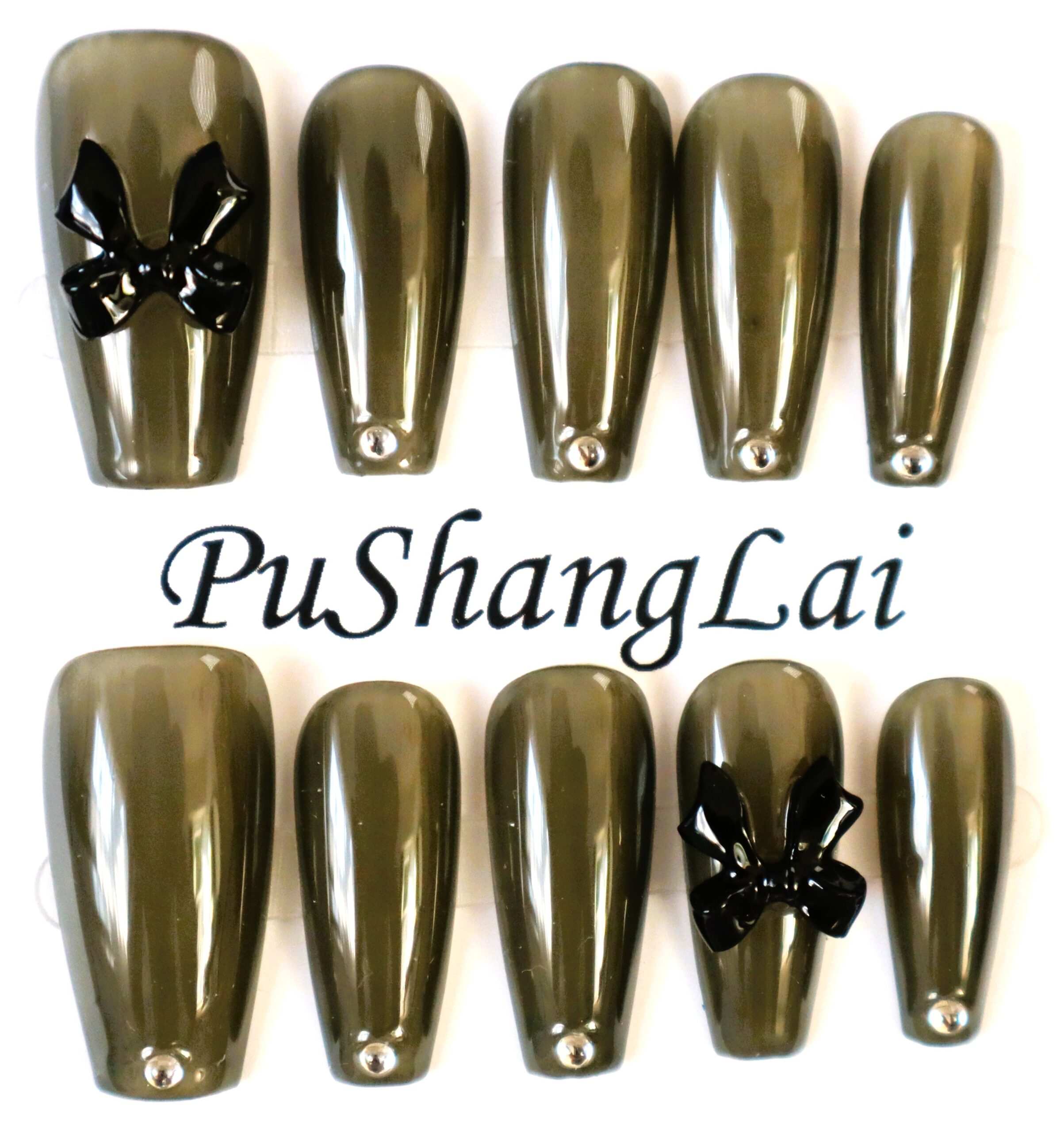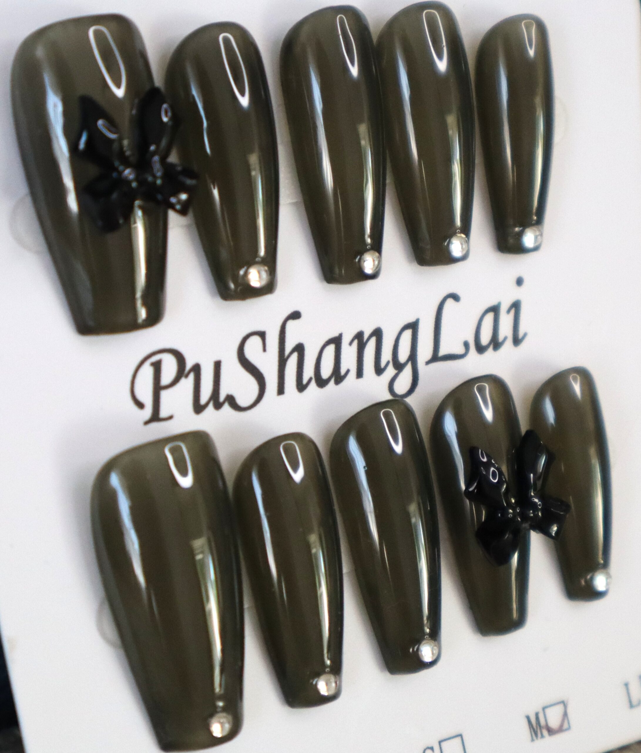 透明感のあるブラックベースにリボン2個の、シンプルなデザインのネイルチップです。長さがあるのでインパクト大。